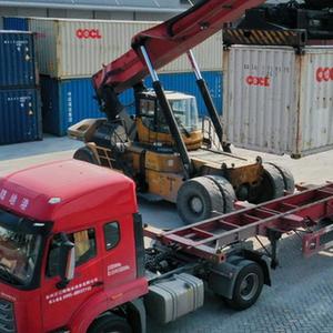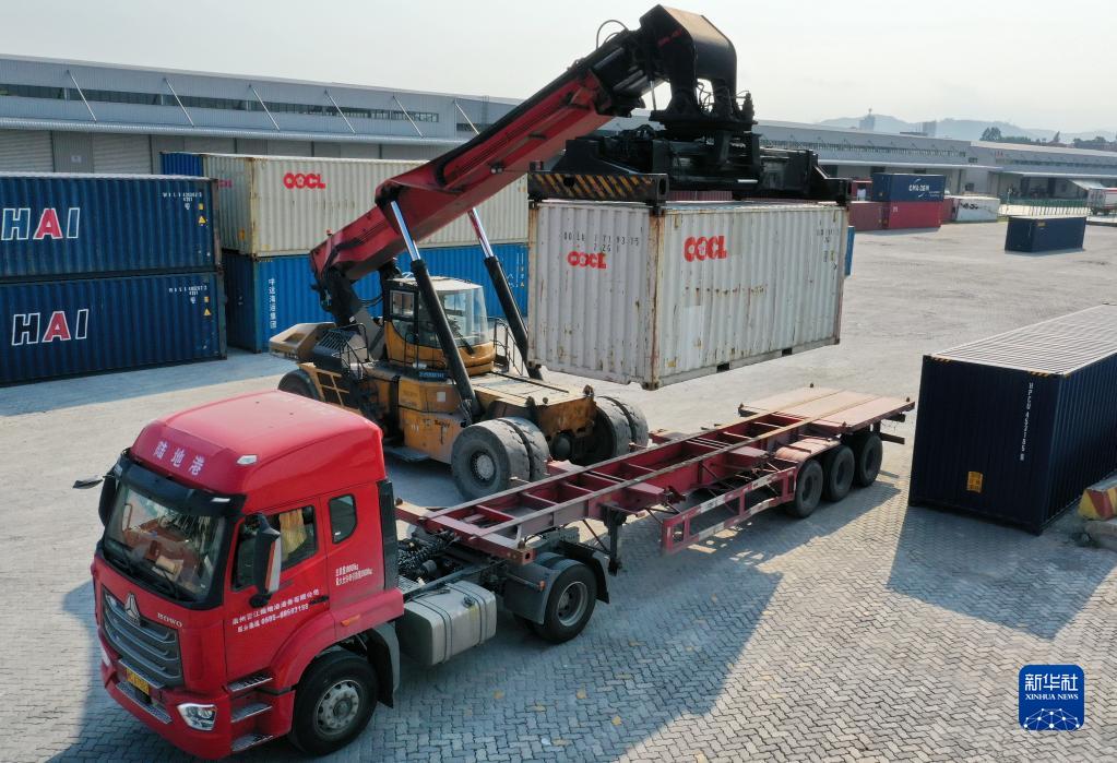 8月15日,福建泉州晉江國際陸地港區工作人員在吊裝準備運往廈門港裝船出口的集裝箱。