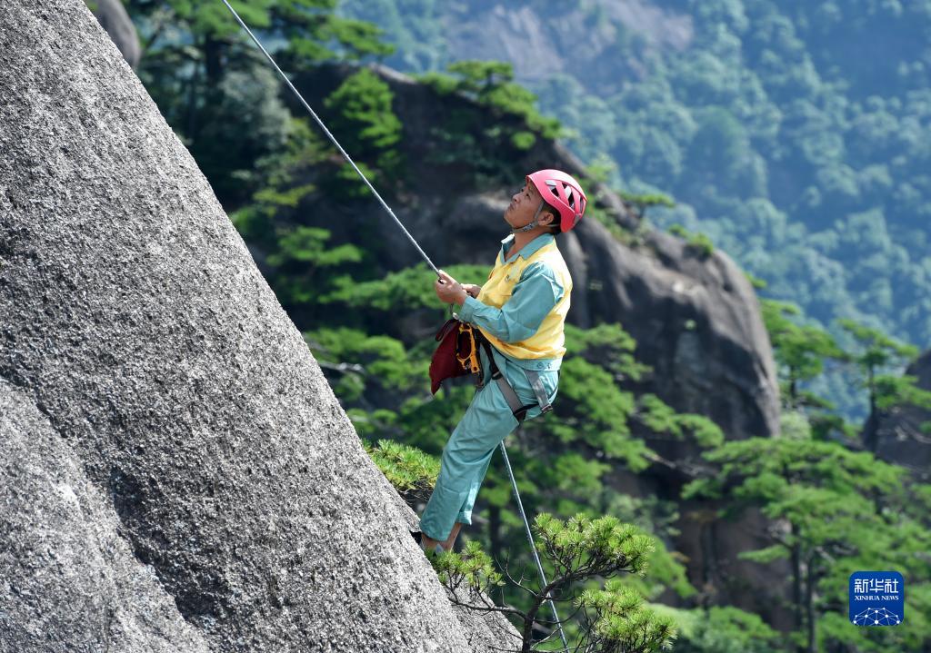 8月15日,李培生在黃山風景區的懸崖峭壁間清撿垃圾。