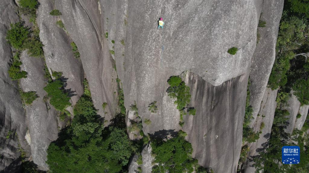 8月15日,李培生在黃山風景區的懸崖峭壁間清撿垃圾(無人機照片)。