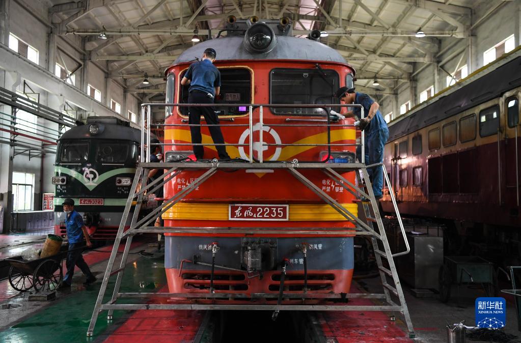 8月16日,廣州機務段職工在檢修機車車頭部件。