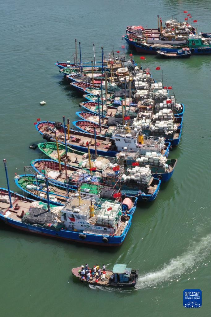 8月16日,福建省福州市連江縣苔菉中心漁港內漁民在為開漁出海做準備(無人機照片)。