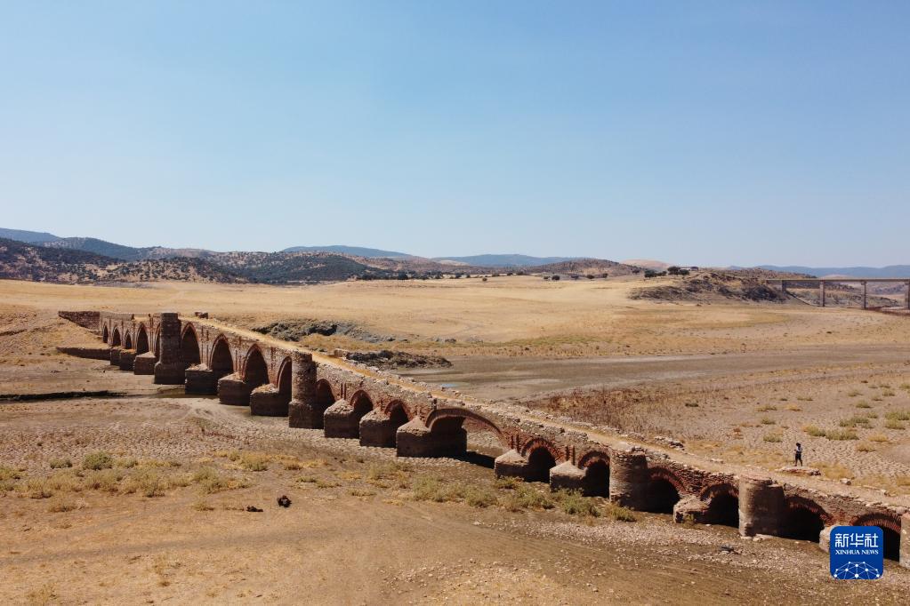 這是8月15日用無人機拍攝的干涸的西班牙錫哈拉水庫,上世紀50年代因水庫落成而被淹沒的梅斯塔古橋重見天日。
