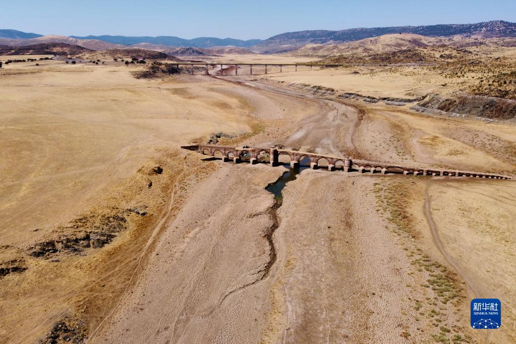 這是8月15日用無人機拍攝的干涸的西班牙錫哈拉水庫,上世紀50年代因水庫落成而被淹沒的梅斯塔古橋重見天日。