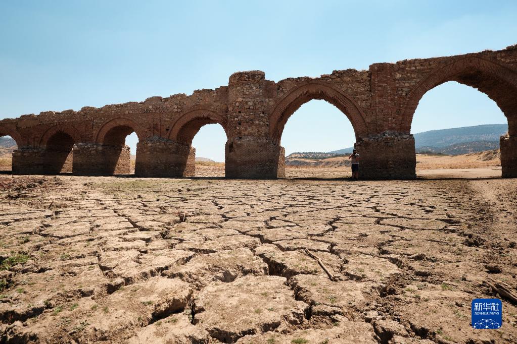 這是8月15日拍攝的干涸的西班牙錫哈拉水庫,上世紀50年代因水庫落成而被淹沒的梅斯塔古橋重見天日。