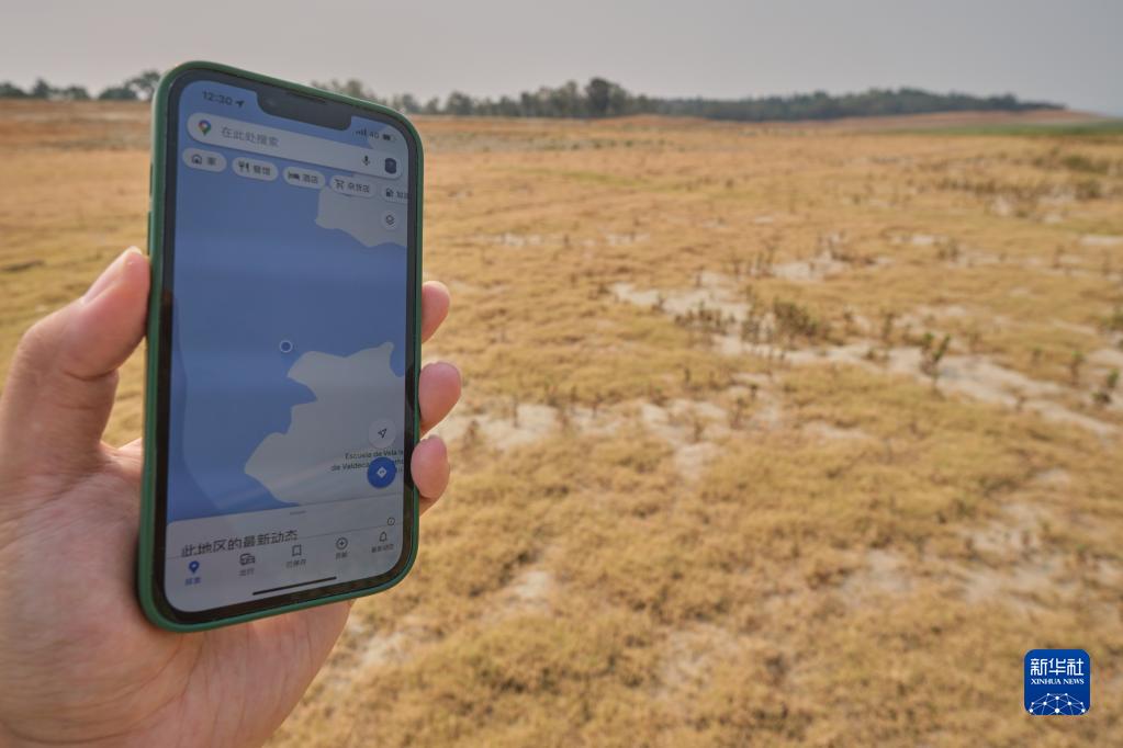 這是8月16日在西班牙巴爾德卡尼亞斯水庫拍攝的畫面,地圖上顯示的水域已經干涸。