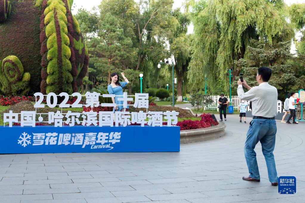 8月16日,游客在哈爾濱國際啤酒節現場留影。