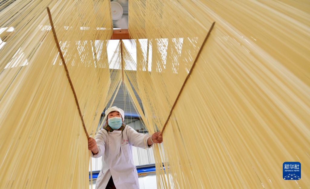 村民在李長滿的老李家手工掛面專業合作社晾曬空心掛面(3月18日攝)。