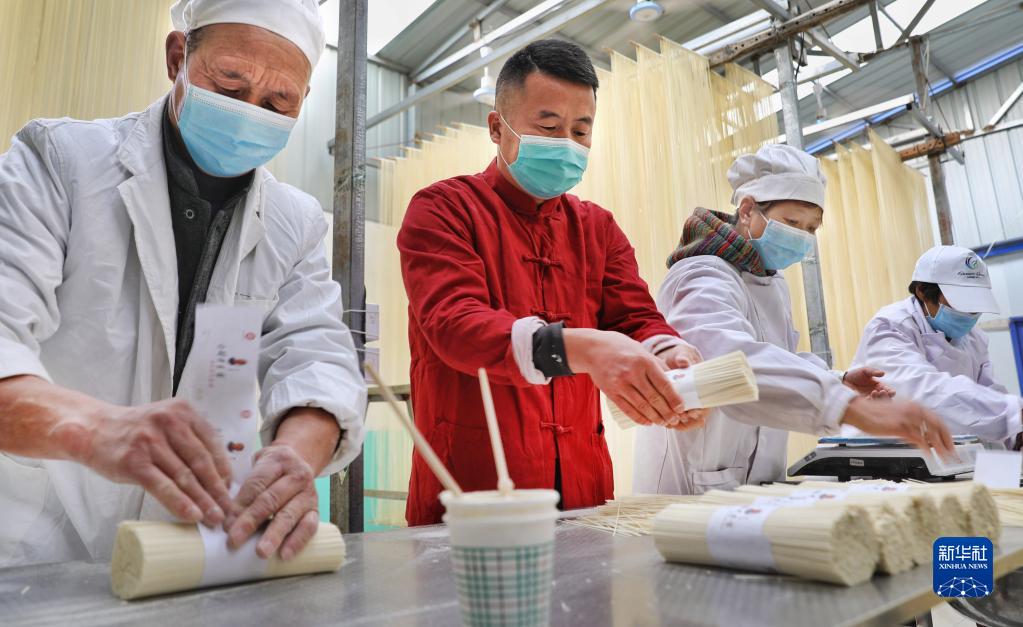 李長滿(左一)在包裝成品空心掛面(3月18日攝)。