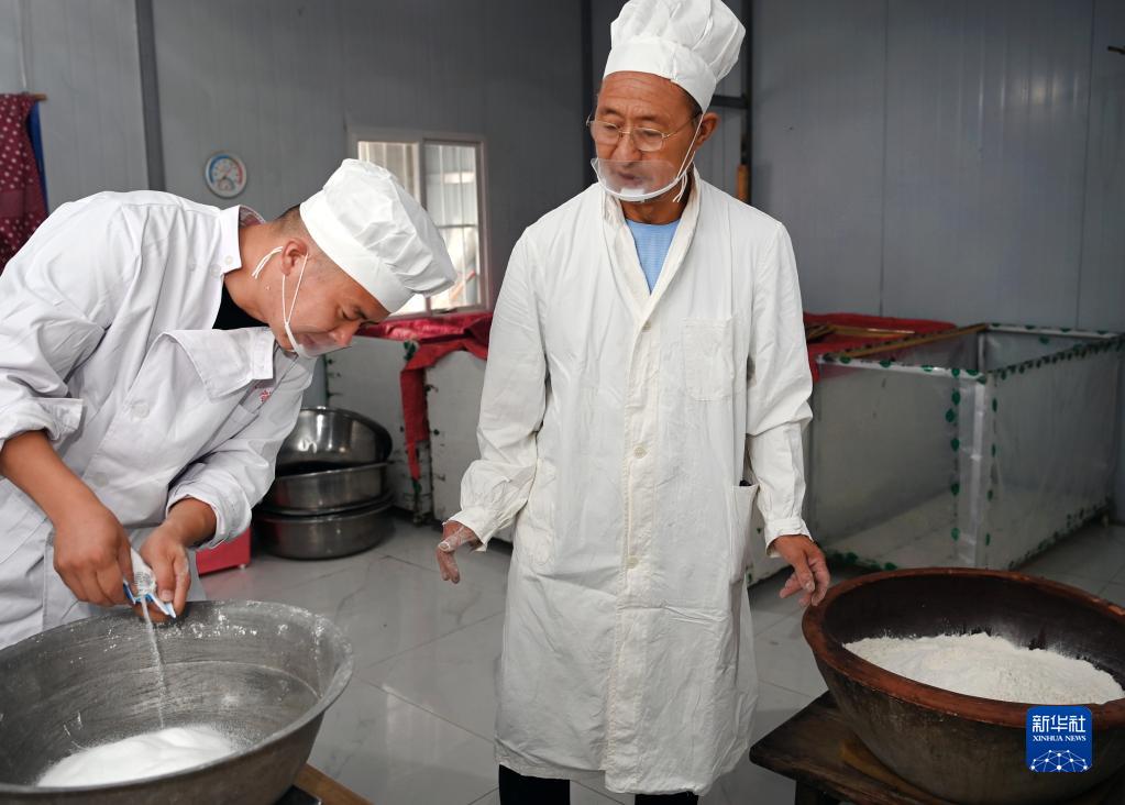 8月16日,李長滿(右)和兒子李念平在準備制作空心掛面原料。