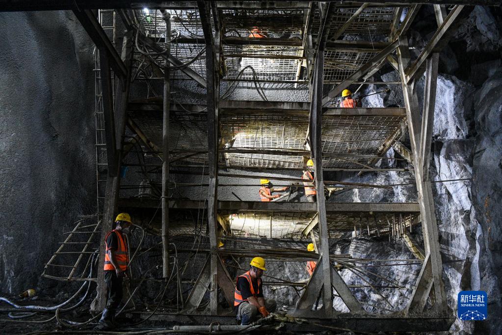 8月16日,在位于廣西環(huán)江毛南族自治縣的貴南高鐵九萬(wàn)大山四號(hào)隧道內(nèi),工作人員用風(fēng)槍打爆破眼。