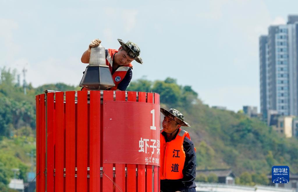 8月16日,長(zhǎng)江重慶航道局巴南航道處的兩名航道工在長(zhǎng)江的一處石梁上進(jìn)行航標(biāo)燈的日常維護(hù)檢修。