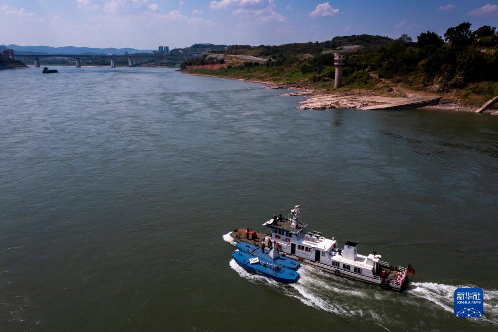 8月16日,長江重慶航道局巴南航道處的一艘航道工作船在轄區的長江水域上進行航標調整作業(無人機照片)。