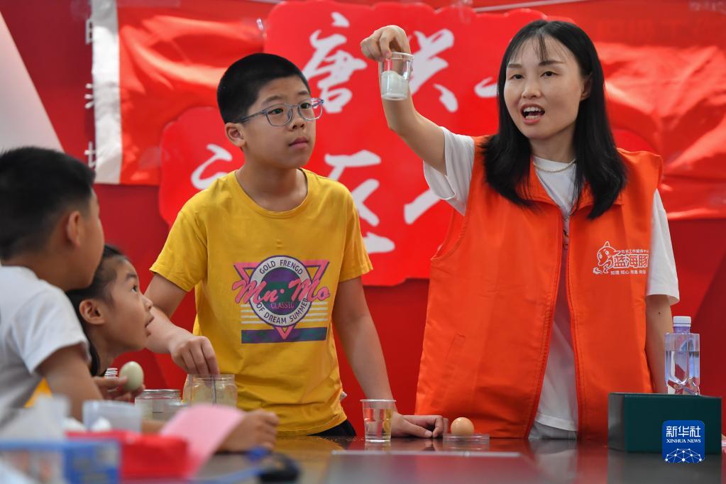 8月17日,在湘潭市雨湖區(qū)窯灣街道唐興寺社區(qū),小朋友在觀看志愿者演示“浮起來的雞蛋”科學(xué)小實(shí)驗。