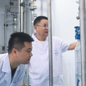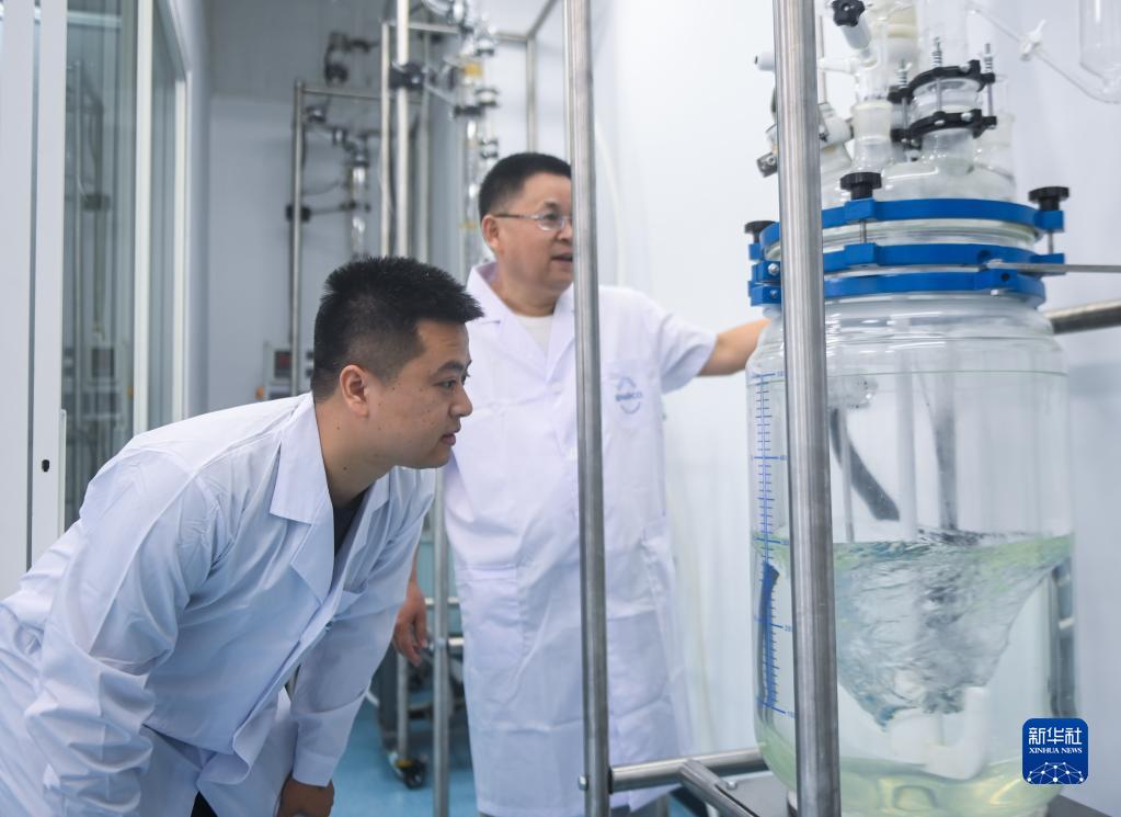 8月17日,在天目醫藥港醫藥產業孵化園的一家生物科技有限公司的實驗室里,杭州市引進人才陳朗(左)查看實驗設備的運行情況。