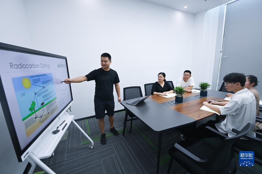 8月17日,在天目醫(yī)藥港醫(yī)藥產(chǎn)業(yè)孵化園的一家生物科技有限公司內(nèi),杭州市引進人才陳朗(左一)和他的團隊在會議室交流。