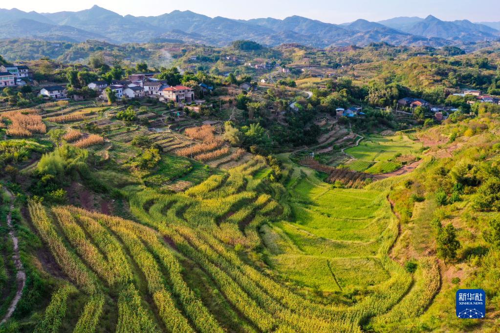 時下,重慶市北碚區三圣鎮是平村的水稻、高粱等農作物相繼進入成熟期。稻田、高粱地、玉米地、民居等相映成趣,美如畫卷。