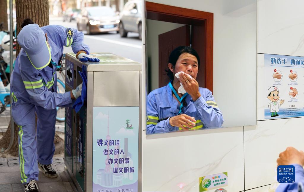 拼版照片:左圖為8月16日上午,環衛工人王新花在飛虹路上清潔垃圾桶;右圖為8月16日中午,到愛心驛站休息的王新花洗去臉上的汗水。