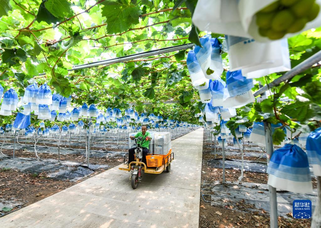 8月17日,在四川省眉山市彭山區(qū)公義鎮(zhèn),工人轉(zhuǎn)運(yùn)收獲的葡萄。