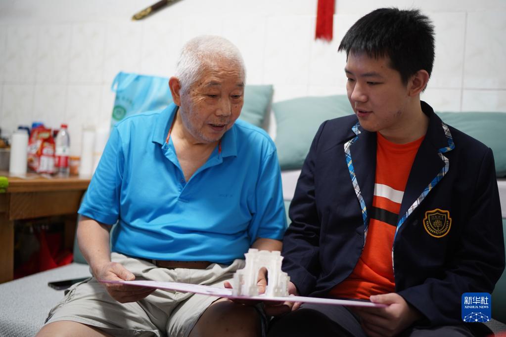 劉熙鴻(右)在家中和爺爺一起翻看錄取通知書(8月11日攝)。