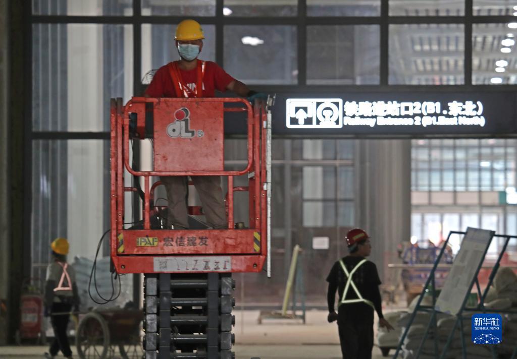 8月17日,工人在廣西南寧國際空港綜合交通樞紐工程施工現(xiàn)場進行裝飾作業(yè)。