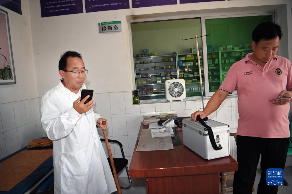 8月17日,村醫牛薛武(右)在村衛生室接到患者的電話,立即動身前往。