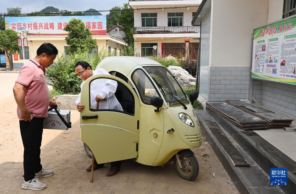 8月17日,村醫牛薛武(右)帶著醫療器具,駕駛殘疾人專用電動車趕往患者住處。