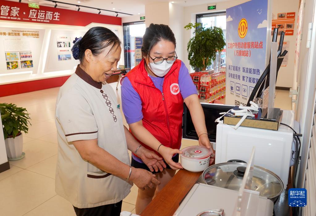 8月17日,重慶市九龍坡區謝家灣街道萬象城的工會戶外勞動者服務站,志愿者幫助一名物業保潔人員加熱自帶的午餐。