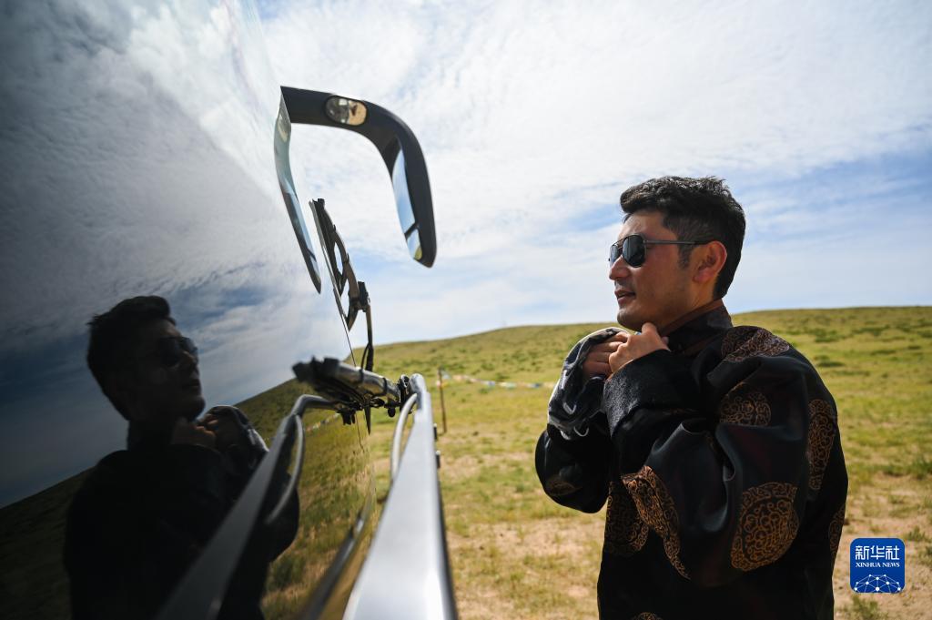 8月17日,在敦達(dá)烏蘇嘎查演出點(diǎn),烏蘭牧騎隊(duì)員在大巴車前整理服裝。