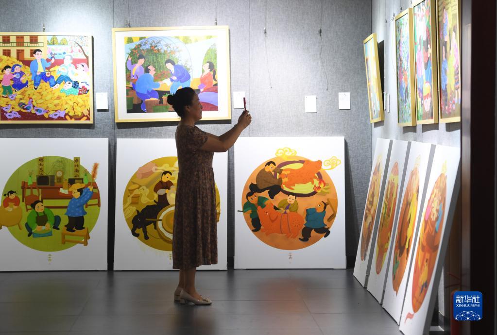 8月18日,在河南省漯河市舞陽農(nóng)民畫院,觀眾在農(nóng)民畫展覽上拍照。