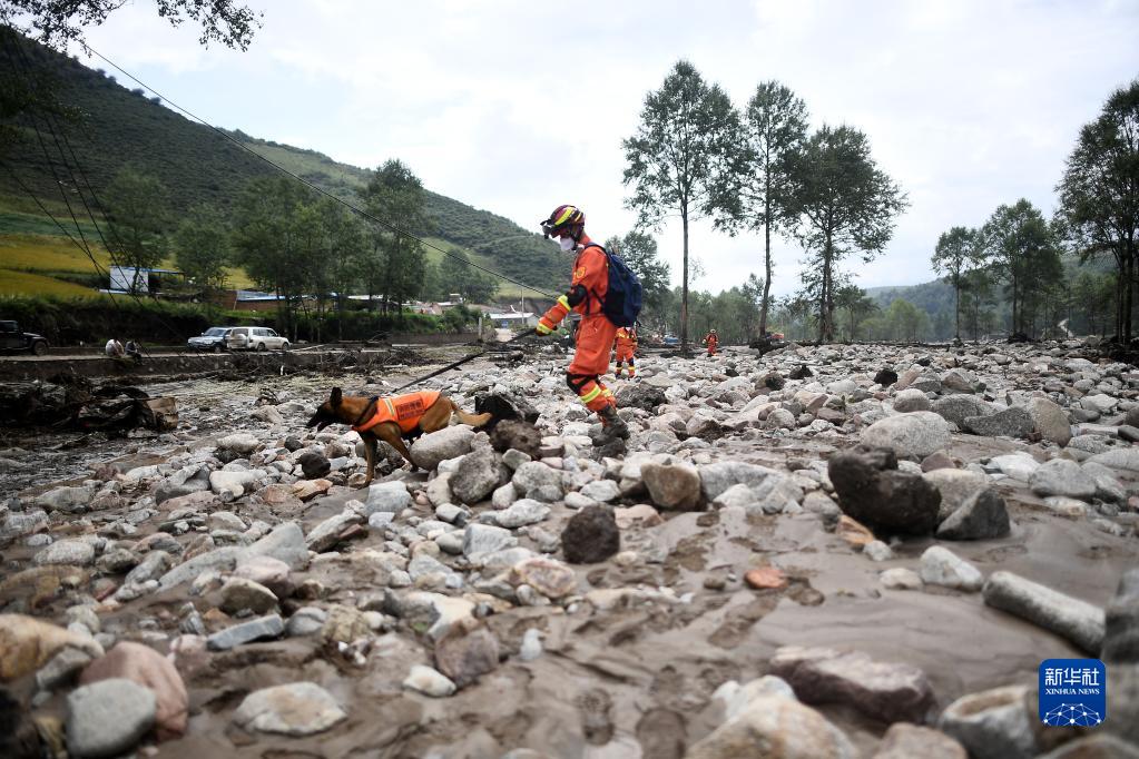 8月18日,消防隊員在青海省西寧市大通回族土族自治縣青山鄉沙岱村開展搜救工作。