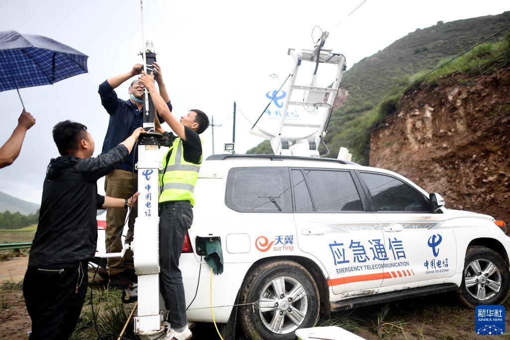 8月18日,中國電信青海公司工作人員在西寧市大通回族土族自治縣青山鄉(xiāng)沙岱村保障應(yīng)急通信服務(wù)。