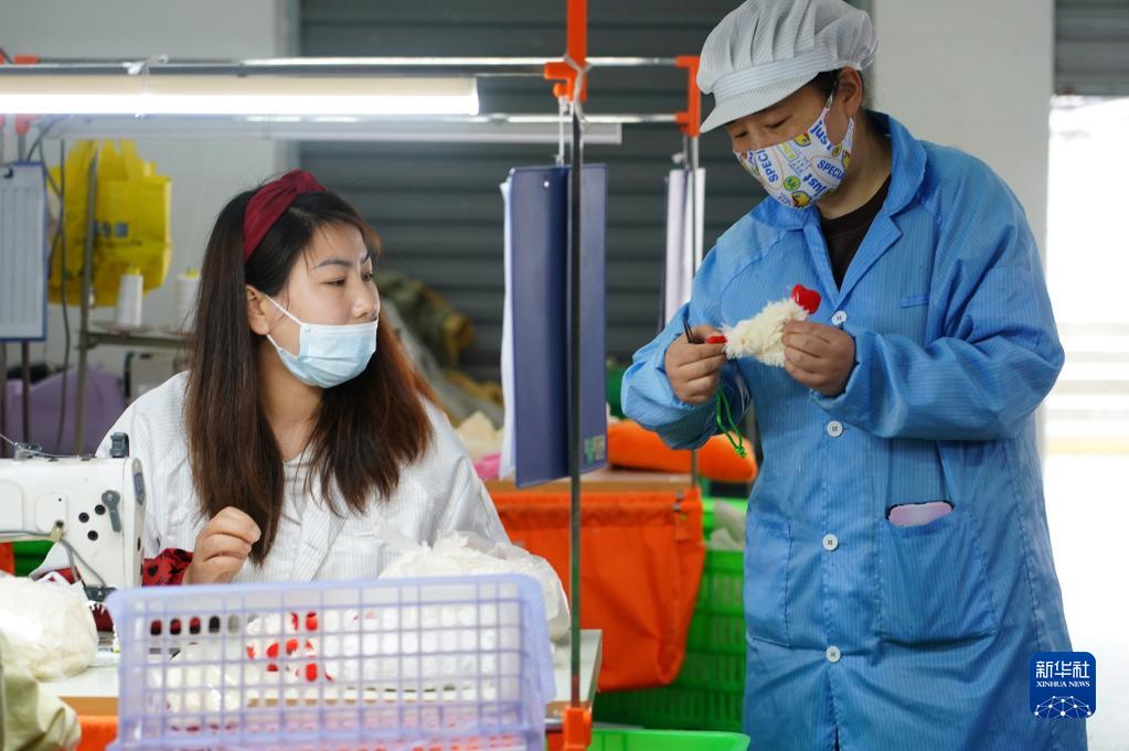 在老縣鎮一家毛絨玩具社區工廠內,技術工人(右)指導工友制作玩具(4月12日攝)。