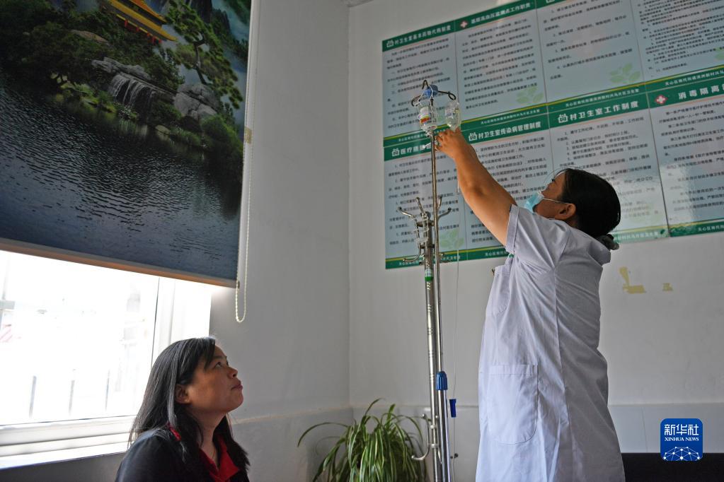 8月17日,顏新艷在衛生室內給村民替換輸液吊瓶。