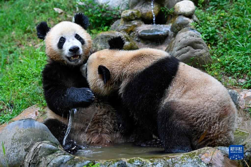 8月18日,中國大熊貓保護(hù)研究中心都江堰基地的大熊貓?jiān)谌ι岬乃乩飸蛩嫠!?/p>