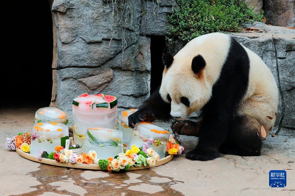 8月18日,中國大熊貓保護(hù)研究中心都江堰基地7歲的雄性大熊貓“青青”在享受清涼生日美食。
