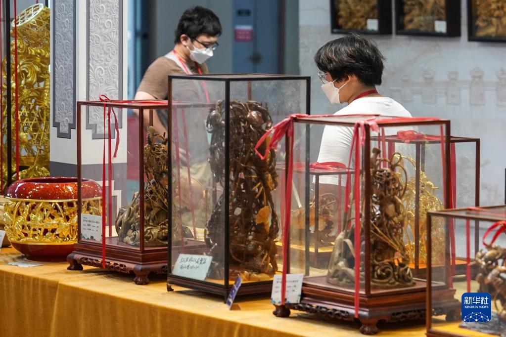8月18日,觀眾在第二屆中國工藝美術博覽會參觀木雕藝術展品。