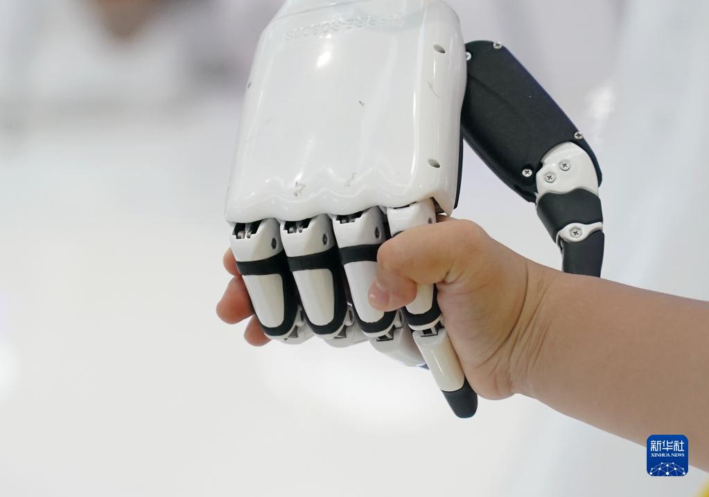 8月18日,在2022世界機(jī)器人博覽會(huì)上,一名小朋友與機(jī)器人握手。