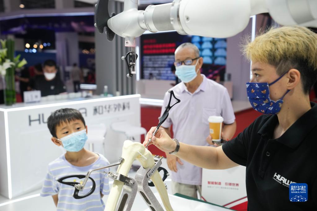 8月18日,工作人員在2022世界機器人博覽會上演示一款骨科手術機器人。