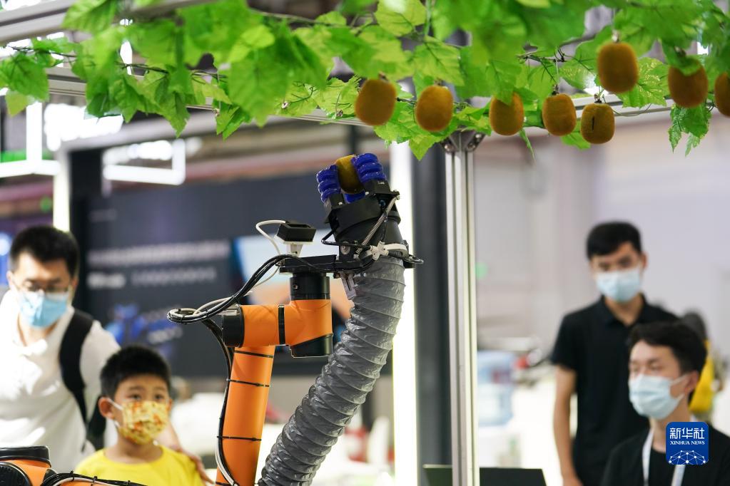 8月18日,參觀者在2022世界機器人博覽會上參觀一款智能采摘機器人。