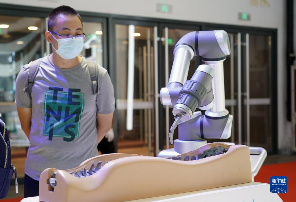 8月18日在2022世界機(jī)器人博覽會(huì)現(xiàn)場拍攝的骨科手術(shù)機(jī)器人。