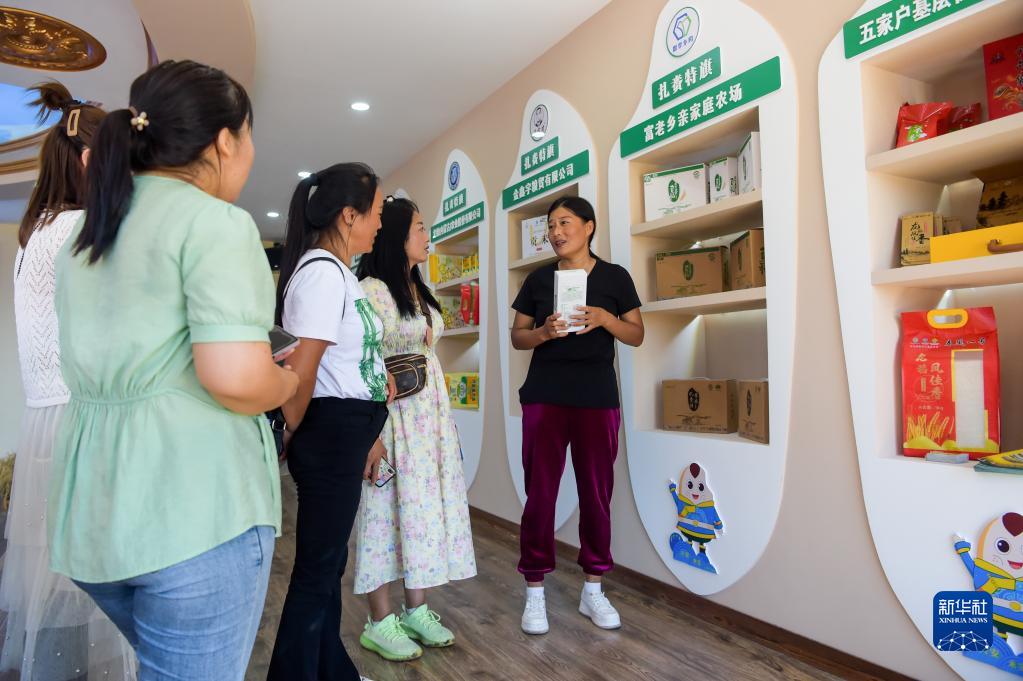 8月17日,在扎賚特旗好力保農業專業合作社的大米展廳,宋春平(右)向游客介紹大米展品。