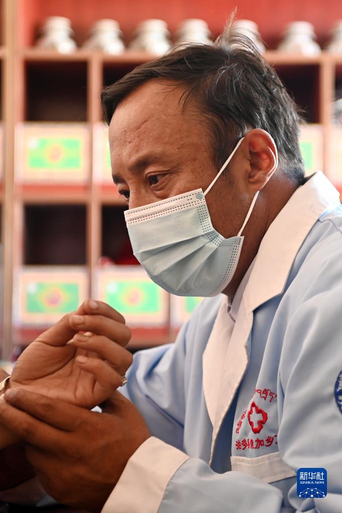 在治多縣索加鄉衛生院,布久索南更青為患者把脈(8月11日攝)。