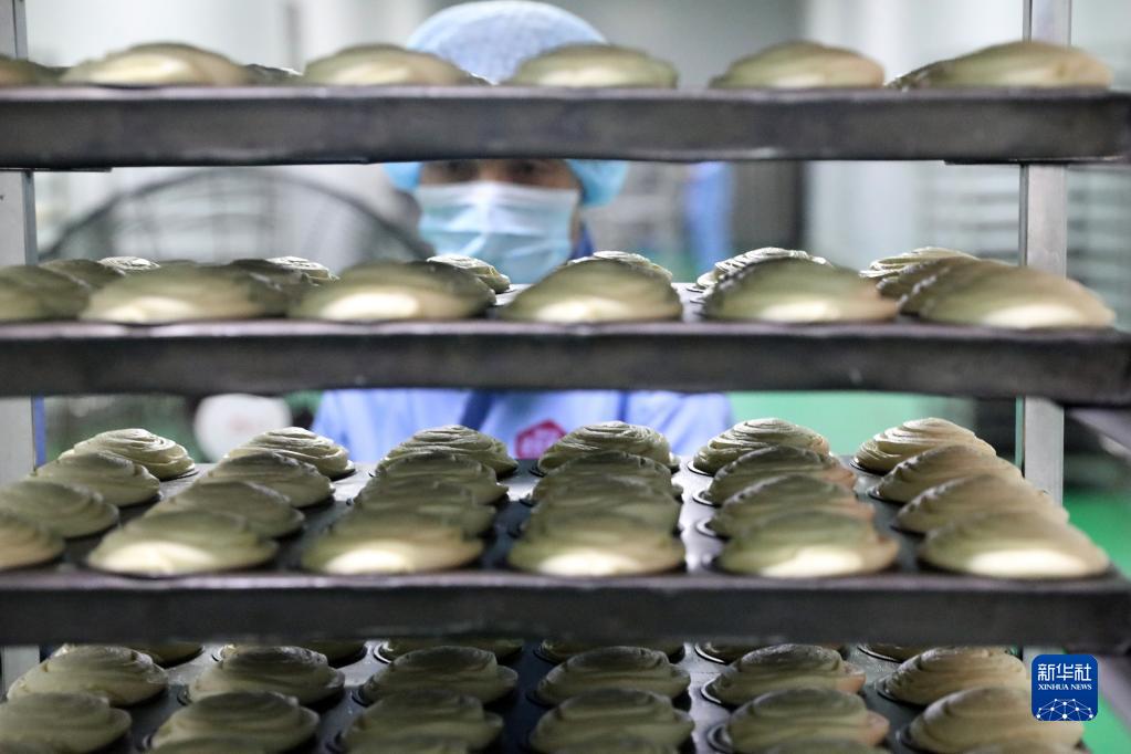 8月18日,在河北馬家麥坊食品有限公司面包生產車間,工人在搬運醒發后的面團入爐烤制。