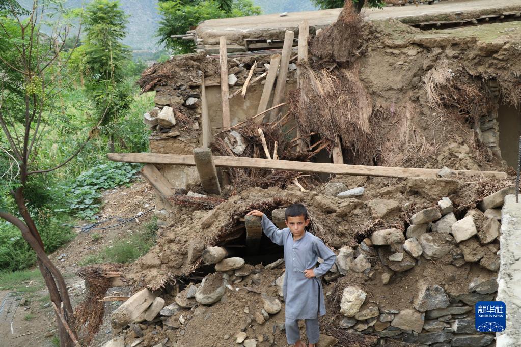 8月18日,一名男孩站在阿富汗努里斯坦省被洪水損毀的房屋旁。