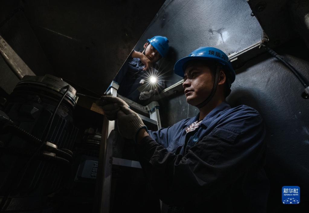 8月18日,三峽姚安發電場工程人員在風力發電機內進行檢修。