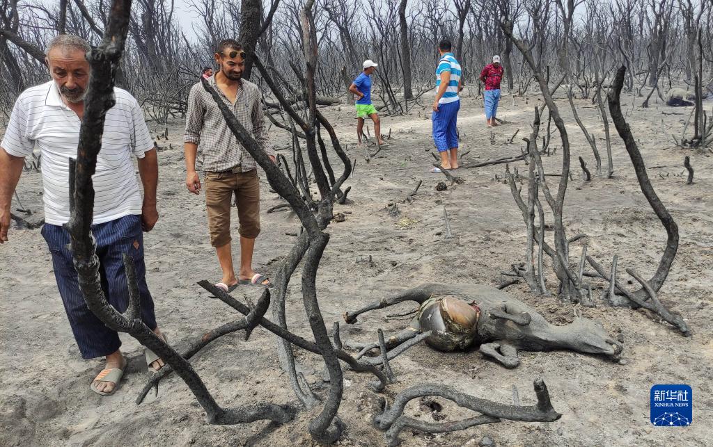8月18日,在阿爾及利亞泰賴夫省,人們查看被森林火災燒死的牲畜。