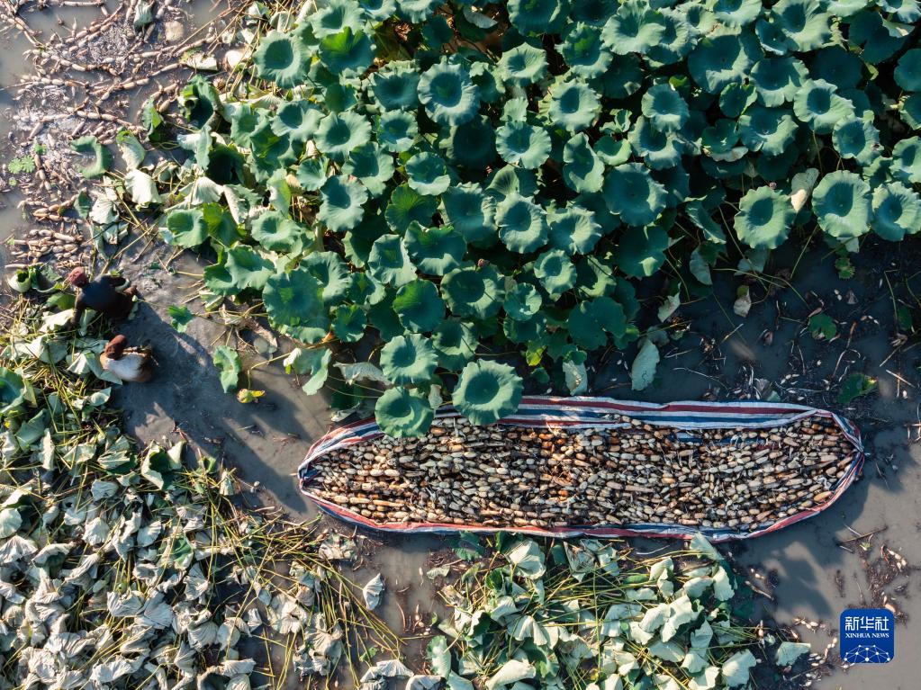 8月19日,種植戶在藕塘里收獲新鮮的蓮藕(無人機照片)。