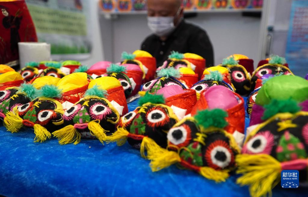 8月19日在第六屆中華老字號(山東)博覽會安徽展區拍攝的傳統虎頭鞋。