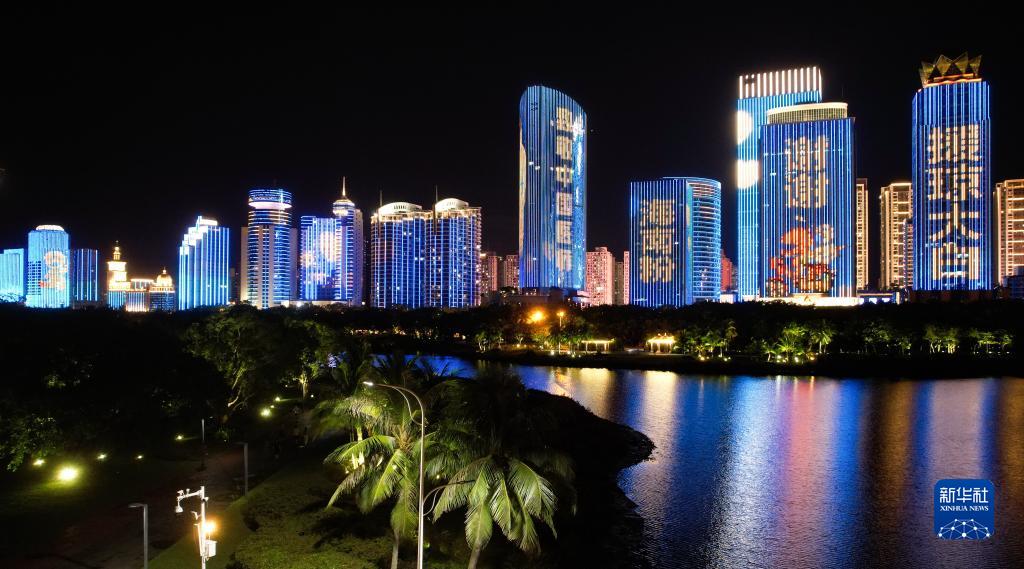 8月19日在海口市濱海大道拍攝的中國醫師節主題燈光秀(無人機照片)。