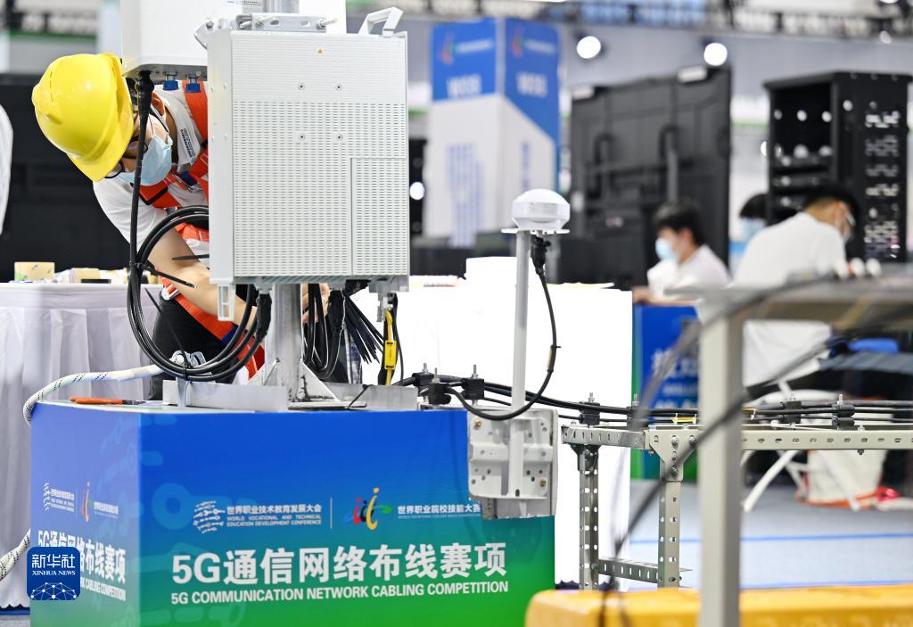 8月19日,首屆世界職業(yè)院校技能大賽的參賽選手在國家會(huì)展中心(天津)進(jìn)行5G通信網(wǎng)絡(luò)布線。
